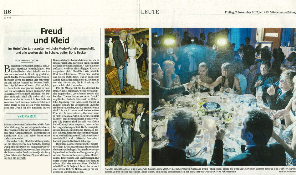 Boris Becker muss sich erst mal bei Lothar Matthäus entschuldigen. Der Ex-Fussballer, dem feierlichen Anlass entsprechend im Smoking gekleidet, grüßt den Ex-Tennisspieler am Mittwochabend im Foyer des Hotels Vier Jahreszeiten und schaut fragend auf Beckers Outfit. Der trägt Sakko und Jeans. "Tut mir leid, ich habe heute morgen um sechs in London die Anzughose liegen gelassen." Das ist normalerweise nicht schlimm. Wo Becker auftaucht, sind alle ausser sich vor Freude, er könnte auch in Tennisshorts kommen. Doch an diesem Abend fühlt sich selbst Boris Becker ein wenig unwohl, denn der Grund für den Empfang lautet: Präsentation eines Online-Portals für festliche Kleidung. Becker entspannt sich erst, als er an einem der mit weissen Rosen, Kerzen und Glasdiamanten geschmücktem Rundtische sitzt und seine Jeans nicht mehr zu sehen ist. Natascha Grün, Model und Designerin, ist Gastgeberin des Abends. Bislang war die blonde Dame bei Münchner Gesellschaftsveranstaltungen vor allem bekannt als Freundin des Produzenten Quirin Berg. ("Das Leben der Anderen"), am Mittwoch ist nun sie gefragt. Denn es ist offenbar noch immer so, wie es Grün erklärt: "Du darfst als Frau ein Kleid niemals zweimal anziehen." Wer da nicht aufpasst, wird von einschlägigen Klatschmagazinen gleich überführt. Wie peinlich! Und das Schlimmste: Wenn eine andere das gleiche Outfit trägt. Das ist an diesem Abend zum Glück nicht der Fall, sieht man von den Herren ab, die im Smoking alle ganz schön gleich aussehen. Für die Männer ist die Kleiderqual der Damen eine bekannte, wenig verständliche Begebenheit. "Die Frauen setzen sich bei dem Thema immer so unter Druck", sagt Becker. Isabelle Prinzessin zu Hohenlohe-Jagstberg vom Modelabel Talbot& Runhof erklärt die Problematik: "Kleider sind für Frauen das was für Männer Autos sind." Je nach Laune und Anlass müsse Frau sich da entscheiden. "Aber man kann ja nicht jedes mal 3000 Euro für ein Kleid zahlen", sagt Schauspielerin Sophie Wepper. Die Damen sind deshalb von Grüns Leihkonzept sehr angetan, manche haben es gleich ausprobiert. Die Schauspielerinnen Simone und Sophia Thomalla tragen ein grauglitzerndes Meerjungfrauenkostüm, was bei Mutter und Tochter recht unterschiedlich wirkt. Viktoria Lauterbach kommt ganz in Weiß mit Schleppe. Die ausgelassene Stimmung bei den Damen liegt auch am Ambiente. Man speist in einem plüschigen Kunstschnee ausgelegtem Saal, an den Seiten Zweige voller glänzender Glassteinchen, dazu gibt es Modenschau, Trüffelpasta und Champagner. Nur Boris Becker sitzt ein wenig steif herum, schön blöd das mit der Hose. Vielleicht schafft Frau Grün ja auf ihrem Portal noch eine kleine Rubrik: Notsmokings für vergessliche Wimbledonsieger.